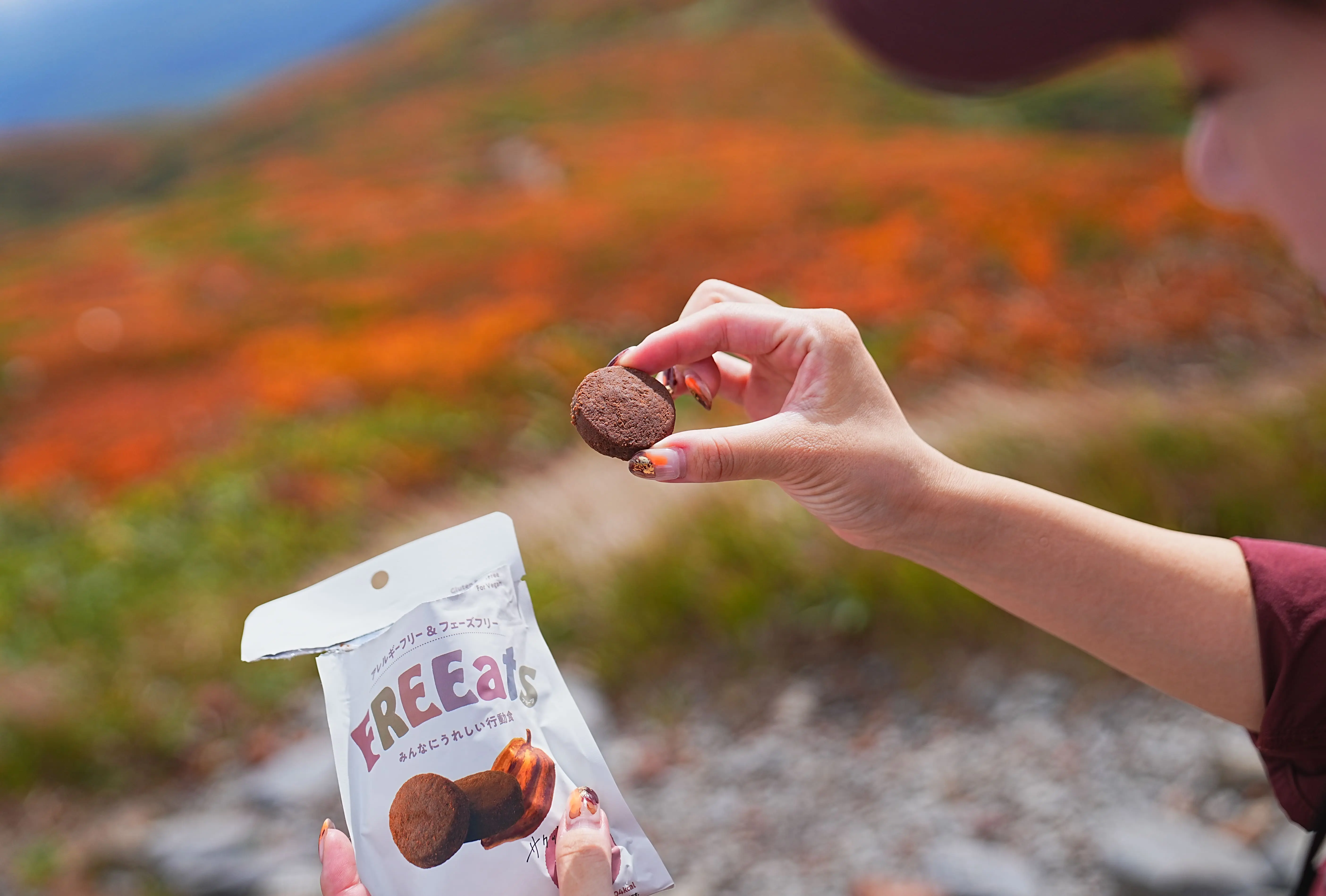 アウトドア会社ならではの発想から生まれた「FREEats」は、ソト遊び中の栄養補給をサポートする「行動食」がコンセプト。しっかりとエネルギー補給ができるのはもちろん、活動中も食べやすいサイズ感と、サクッとした軽い食感に仕上げました。パッケージもコンパクトで軽く、アウトドアやスポーツなど活動の妨げにならないよう配慮されています。